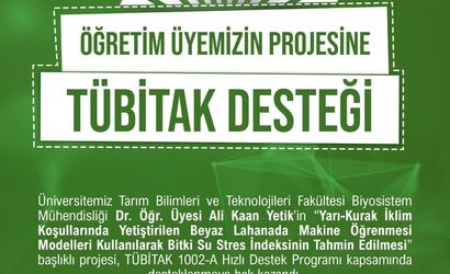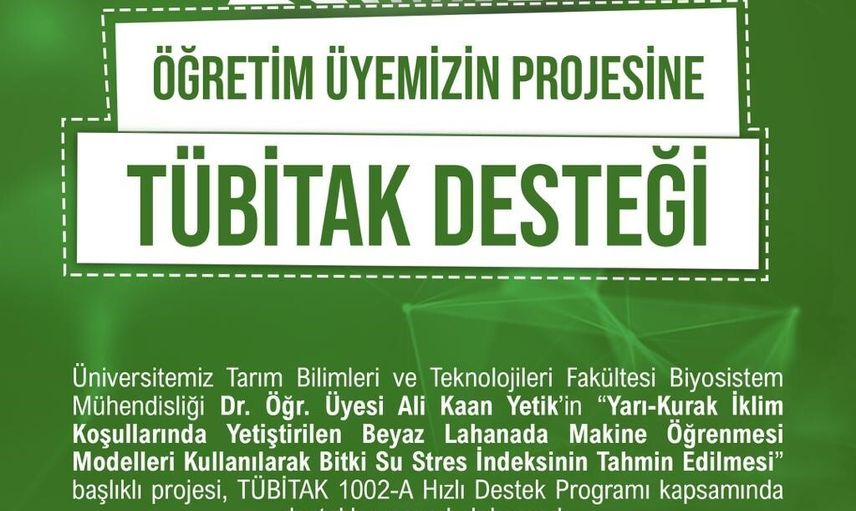 Niğde Ömer Halisdemir Üniversitesi Tarım Bilimleri ve Teknolojileri Fakültesi Biyosistem Mühendisliği Bölümü öğretim üyesi Dr. Ali Kaan Yetik tarafından hazırlanan "Yarı-Kurak İklim Şartlarında Yetiştirilen Beyaz Lahanada Makine Öğrenmesi Modelleri Kullanılarak Bitki Su Stres İndeksinin Tahmin Edilmesi" başlıklı proje, TÜBİTAK 1002-A Hızlı Destek Programı kapsamında desteklenmeye hak kazandı.