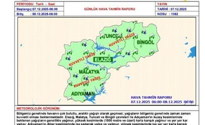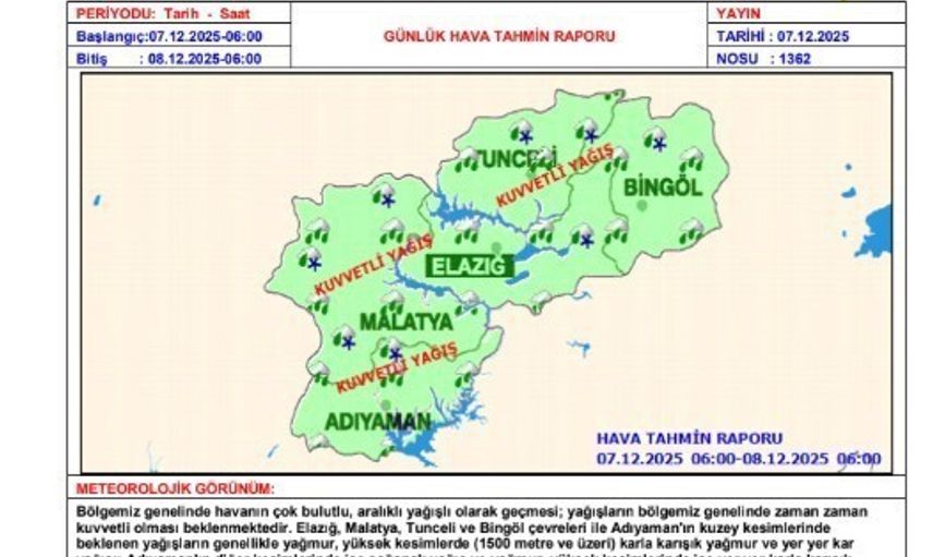 "Bölgemiz genelinde beklenen kuvvetli yağışların, Elazığ, Malatya, Tunceli ve Bingöl çevreleri ile Adıyaman’ın kuzey kesimlerinde kuvvetli yağmur yüksek kesimlerinde ise (Bin 500 metre rakım üzeri) kuvvetli karla karışık yağmur ve kar yağışı beklenmektedir. Bu nedenle oluşması beklenen ani sel, su baskını, ulaşımda aksamalar, kar yağışı olan yerlerde buzlanma ve don olayı, yağış anında kuvvetli rüzgar ve tipi gibi olumsuzluklara karşı dikkatli olunmalıdır"