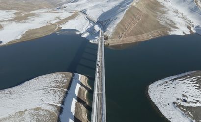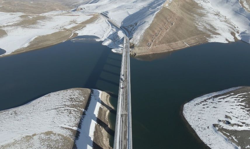 Erzincan'ın Çayırlı ilçesindeki Turnaçayırı Barajı ve bölgeye erişimi sağlayan köprü, etkili kar yağışının ardından drone ile görüntülenerek kartpostallık manzaralar oluşturdu.