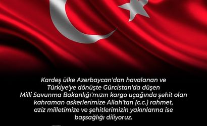"Kardeş ülke Azerbaycan’dan havalanan ve Türkiye’ye dönüşte Gürcistan’da düşen Milli Savunma Bakanlığı’mızın kargo uçağında şehit olan kahraman askerlerimize Allah’tan rahmet, aziz milletimize ve şehitlerimizin yakınlarına ise başsağlığı diliyoruz"