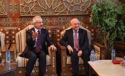 Ulaştırma ve Altyapı Bakanı Abdulkadir Uraloğlu (solda), Şam'daki resmi temasları kapsamında Suriye Bayındırlık ve İskan Bakanı Mustafa Abdulrezzak (sağda) ile bir araya geldi.