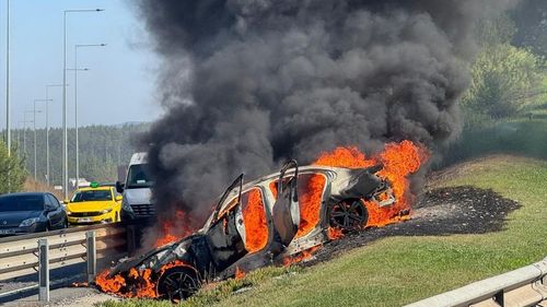 Ümraniye'de Kuzey Marmara Otoyolu'nda kaza yapan otomobil alev alarak kullanılamaz hale geldi.