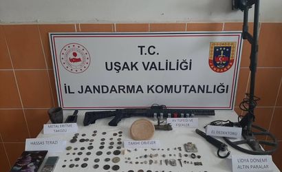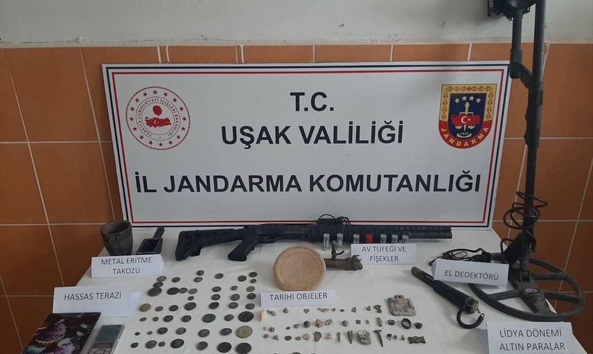 Uşak'ın Ulubey ilçesinde bir evde yapılan aramada, aralarında Lidya dönemine ait olduğu değerlendirilen altın ve gümüş paraların da yer aldığı 117 obje, 2 el dedektörü, 1 ruhsatsız av tüfeği ile 2 hassas terazi ele geçirildi. Olayla ilgili bir kişi gözaltına alındı.