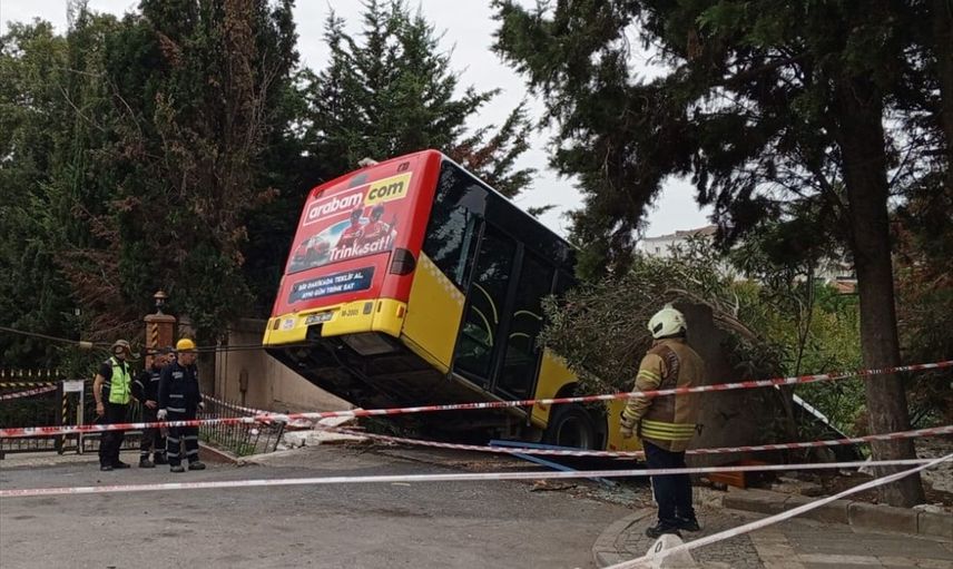 Üsküdar Barbaros Mahallesi Üsküdar Devlet Hastanesi önündeki peron alanında park halindeyken el freni çekilmeyen İETT otobüsü, çarptığı bir sitenin istinat duvarını yıkarak asılı kaldı.