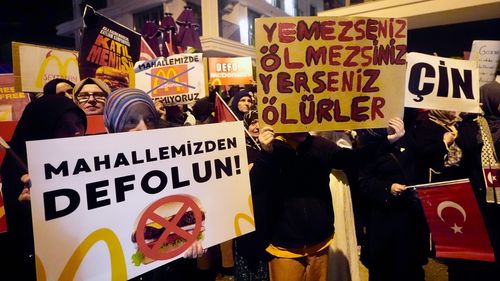 Üsküdar'da McDonald's Protestosu 6. Gününde Bahçelievler Mahallesi'nde açılması planlanan şube önünde eylem sürüyor Üsküdar'da mahalle sakinleri, Bahçelievler Mahallesi Kaldırım Caddesinde açılması planlanan McDonald's şubesi önünde başlattıkları protestonun altıncı gününde bir araya geldi. Grup, üzerinde "Mahallemizde katil İsrail destekçisi istemiyoruz" yazılı…