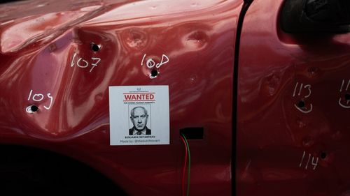 Utrecht'te 29 Ocak 2024'te öldürülen 6 yaşındaki Hind Receb'in bulunduğu araç temsili olarak sergilendi; ziyaretçiler broşür ve çiçek bıraktı.