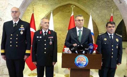 VALİ ATİLLATOROS'A AÇIKLAMASI SIRASINDA İL EMNİLET MÜDÜRÜ İDRİS YILMAZ, JANDARMA ALAY KOMUTANI TUĞGNERAL ERCAN ATASOY VE SALİH GÜVENLİK AKDENİZ BÖLGE KOMUTANI TUĞAMİRAL GÖKMEN GÜCÜYEN EŞLİK ETTİ.