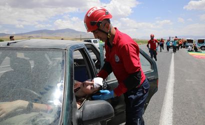 Van'ın Erciş ilçesinde ekiplerin senaryo gereği trafik kazasına karışan araçtaki yaralıları kurtardığı tatbikat gerçeğini aratmadı. Ulusal Medikal Kurtarma Ekibi (UMKE) koordinasyonunda 4 ilden 125 personelin katılımıyla düzenlenen eğitim kampı kapsamında Van-Erciş kara yolunda tatbikat yapıldı.