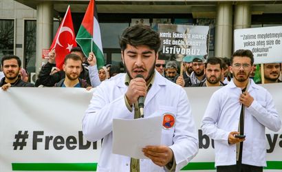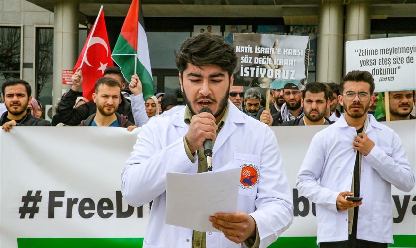 Van'da, sağlık çalışanları ve üniversite öğrencileri, İsrail'in Gazze'ye yönelik saldırılarını protesto etmek amacıyla bir araya geldi. Van Yüzüncü Yıl Üniversitesi (YYÜ) Dursun Odabaş Tıp Merkezi önünde düzenlenen eylemde, Türk ve Filistin bayrakları ile bir dizi pankart taşındı.