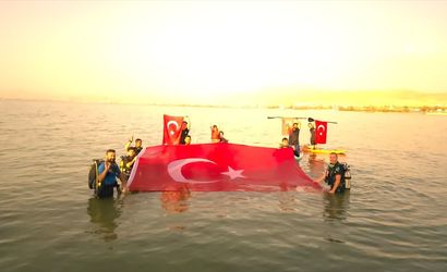 Van'ın Edremit ilçesinde faaliyet gösteren Dive Ank Dalış Okulu sporcuları, 30 Ağustos Zafer Bayramı dolayısıyla Van Gölü'nde Türk bayrağı açtı.