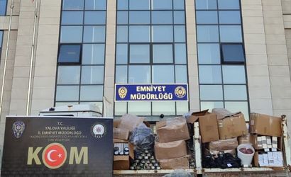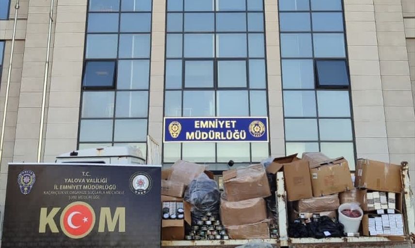 Yalova'da düzenlenen operasyonda saç düzleştirici, elektrikli süpürge, ütü, epilasyon cihazı, kulaklık gibi ürünlerden oluşan 34 elektronik eşya, 40 elektronik sigara, sahte bandrol, 60 bin dolu makaron, 77 bin 400 boş makaron, 175 kilogram nargile tütünü, 407 aroma verici, 20 bin boş sigara kutusu, 2 bin 600 boş plastik nargile kutusu, 25 kilogram açık tütün ve 120 sahte etiket ele geçirildi, 3 şüpheli gözaltına alındı.