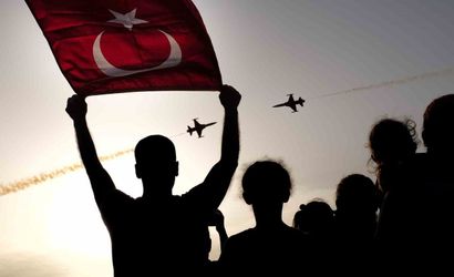 Mehmet Yılmaz — İzmir, "İstikbal Göklerdedir"; elinde Türk bayrağı olan bir adam ve gösteri uçaklarının süzüşünü bir araya getiriyor.