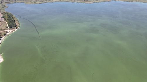 Yeniçağa Gölü, alg patlaması nedeniyle yeşil bir görüntüye büründü, bu durum havadan görüntülendi.