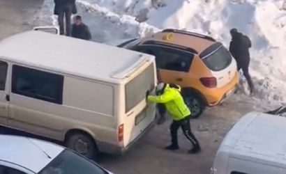Hakkari’nin Yüksekova ilçesinde, yoğun buzlanma nedeniyle Soryan İş Merkezi mevkiinde yolda mahsur kalan bir kamyonet, bölgede görevli bir trafik polisi tarafından itilerek hareket ettirildi.