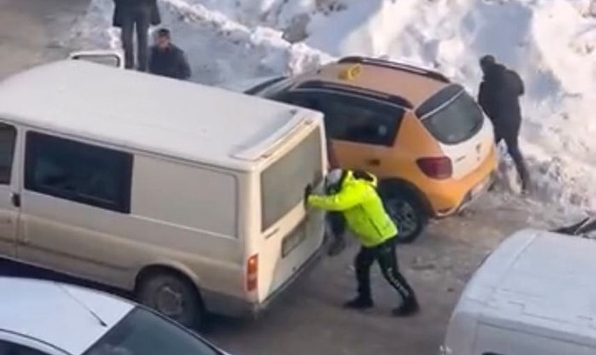 Tekerlekleri buzda boş dönünce ilerleyemeyen kamyoneti fark eden trafik polisi, müdahale ederek aracın kurtarılmasını sağladı. Olay sırasında çevredeki vatandaşlar da polise destek verdi; yardım anları kameraya yansıdı.