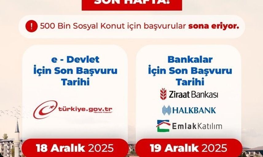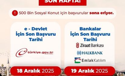 TOPLU KONUT VE KAMU ORTAKLIĞI İDARESİ BAŞKANLIĞI'NDAN (TOKİ) YAPILAN AÇIKLAMAYA GÖRE 500 BİN SOSYAL KONUT İÇİN BAŞVURU TARİHLERİNİN E-DEVLET İÇİN 18 ARALIK, BANKA ARACILIĞIYLA YAPILAN BAŞVURULARIN İSE 19 ARALIK'TA SONA ERECEĞİ AÇIKLANDI.