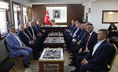 AK Parti Genel Başkan Yardımcısı Zafer Sırakaya (sağ 3), Mardin'deki ziyaretleri kapsamında Midyat Belediyesi'ni ziyaret etti. Ziyarette Belediye Başkanı Veysi Şahin (sol 2) hazır bulundu.