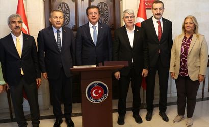 AK Parti Genel Başkan Yardımcısı Nihat Zeybekci (sağda), Kilis'teki programı kapsamında Vali Tahir Şahin'i (solda) ziyaret etti.