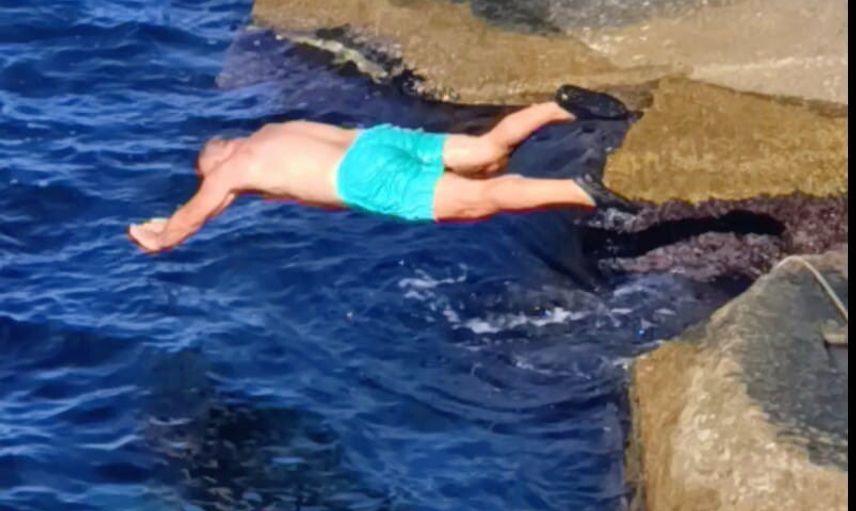 Dakikalarca denizde kalan adam, bir süre sonra sudan çıkarak kıyıda güneşlendi.