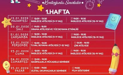 19 Ocak Pazartesi – Program, İngilizce Atölyesi ile başlıyor. 9-11 yaş grubu çocuklar 12.00-13.30 saatleri arasında, 12-14 yaş grubu ise 14.00-15.30 saatleri arasında pratik yapma fırsatı bulacak.