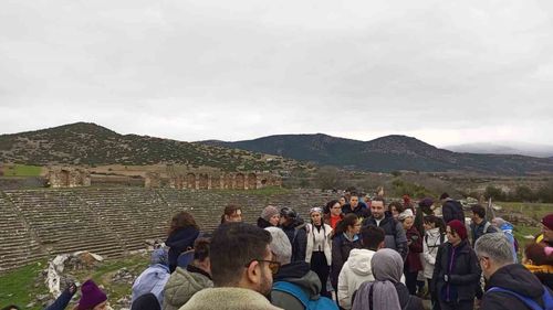 Aydın Büyükşehir Belediyesi'nin Afrodisias etkinliğinde vatandaşlar trekking yaparak UNESCO mirasını keşfetti, rehber anlatımıyla tarihle iç içe bir gün geçirdi.