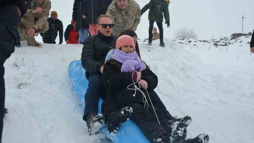 Bulanık Kaymakamlığı öncülüğünde düzenlenen kış şenliğinde çocuklar jandarma ile kızak kaydı, hediyeler aldı; SYDV mont, bot ve eldiven dağıttı.