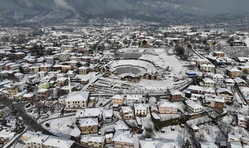 Antik kentin sütunları, tiyatro kalıntıları ve tarihi yapıları karla kaplanırken, beyaz örtü geçmişle bugünü bir araya getiren görsel bir şölen sundu. Kar, bölgenin doğal güzellikleri ile tarihi dokuyu bütünleştirerek nadir görüntüler oluşturdu.