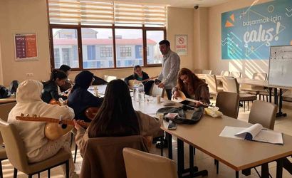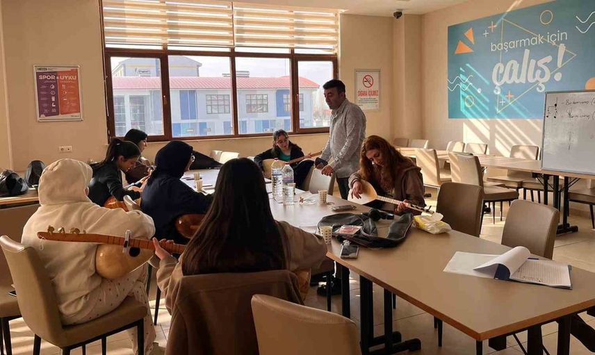 Eskişehir'de Hızır Bey Yurdundaki kız öğrenciler, bağlama kursunda keyifli ve verimli zaman geçiriyor.