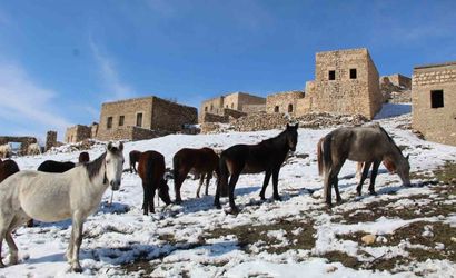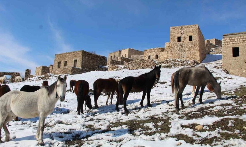 Şırnakın İdil ilçesine bağlı Gabar Dağı eteklerindeki Mağara köyü, tarihi varlıklarının yanı sıra doğal güzellikleri ve kışın ortaya çıkan manzarasıyla dikkat çekiyor. Bölgede yaşayan yılkı atları, karla kaplı alanda dörtnala koşarken fotoğrafçıların objektiflerine takıldı.