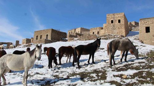 Şırnak İdil'deki Mağara köyünde sayısı 100'ü bulan yılkı atları, karla kaplı arazide dörtnala koşarken fotoğrafçıların ilgisini çekti.