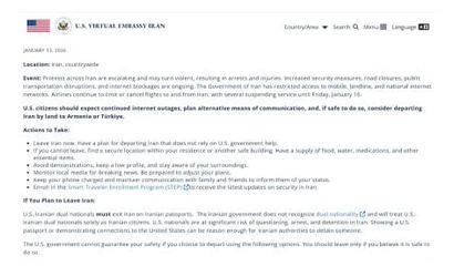 Havayollarının bazı seferleri 16 Ocak Cuma gününe kadar askıya aldığı ifade edilirken, ABD vatandaşlarına internet kesintilerinin devam edebileceğini beklemeleri ve alternatif iletişim yöntemleri planlamaları tavsiye edildi. Eğer güvenli ise kara yoluyla İran’dan Ermenistan veya Türkiye’ye geçmeyi düşünmeleri istendi.
