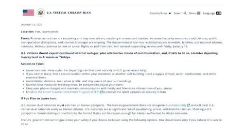 ABD Dışişleri Bakanlığı, artan karışıklıklar nedeniyle vatandaşlarına İran’ı derhal terk etmelerini, alternatif iletişim ve kara yoluyla çıkış planı yapmalarını önerdi.