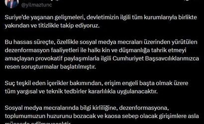 ADALET BAKANI YILMAZ TUNÇ, SURİYE’DE YAŞANAN GELİŞMELERE İLİŞKİN YAPILAN PAYLAŞIMLAR HAKKINDA, "HALKI KİN VE DÜŞMANLIĞA TAHRİK ETMEYİ AMAÇLAYAN PROVOKATİF PAYLAŞIMLARLA İLGİLİ CUMHURİYET BAŞSAVCILIKLARIMIZCA RESEN SORUŞTURMALAR BAŞLATILMIŞTIR" DEDİ.