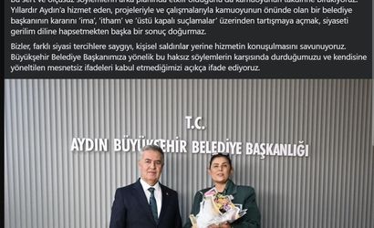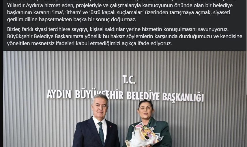 "Aydın Büyükşehir Belediye Başkanımız Özlem Çerçioğlu’nun kamuoyuna açık şekilde ifade ettiği üzere; siyasi tercihine ilişkin kararını kendi iradesiyle, herhangi bir baskı, tehdit ya da zorlamaya maruz kalmadan almıştır. Bu kararın farklı anlamlara çekilmesini ya da ima yoluyla sorgulanmasını kabul etmiyoruz. Ne yazık ki CHP Genel Başkanı Özgür Özel’in kullandığı ithamkar ve incitici ifadeler, siyasi nezakete de kamuoyunun doğru bilgilendirilmesine de hizmet etmemektedir. Bir belediye başkanının onurunu ve emeğini hedef alan bu dili doğru bulmuyor, açıkça kınıyoruz. Son altı ayda Aydın genelinde temeli atılan ve kısa süre içerisinde başlayacak olan önemli projelerin, bu sert ve ölçüsüz söylemlerin arka planında etkili olduğunu da kamuoyunun takdirine bırakıyoruz. Yıllardır Aydın’a hizmet eden, projeleriyle ve çalışmalarıyla kamuoyunun önünde olan bir belediye başkanının kararını ‘ima’, ‘itham’ ve ‘üstü kapalı suçlamalar’ üzerinden tartışmaya açmak, siyaseti gerilim diline hapsetmekten başka bir sonuç doğurmaz. Bizler, farklı siyasi tercihlere saygıyı, kişisel saldırılar yerine hizmetin konuşulmasını savunuyoruz. Büyükşehir Belediye Başkanımıza yönelik bu haksız söylemlerin karşısında durduğumuzu ve kendisine yöneltilen mesnetsiz ifadeleri kabul etmediğimizi açıkça ifade ediyoruz."