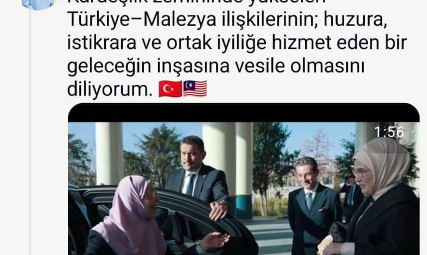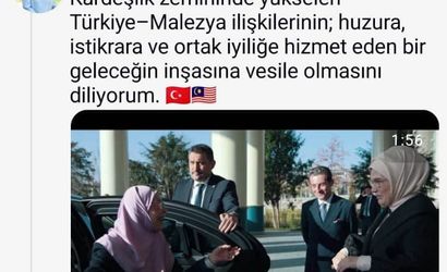 NSosyal hesabından yapılan paylaşımda Emine Erdoğan şu ifadeyi kullandı: "Kardeşlik zemininde yükselen Türkiye-Malezya ilişkilerinin huzura, istikrara ve ortak iyiliğe hizmet eden bir geleceğin inşasına vesile olmasını diliyorum".