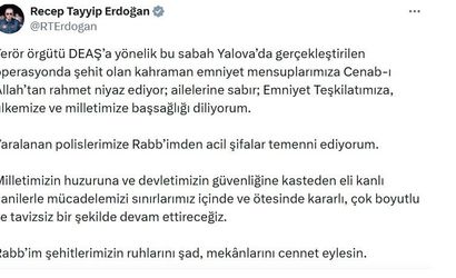 "Terör örgütü DEAŞ’a yönelik bu sabah Yalova’da gerçekleştirilen operasyonda şehit olan kahraman emniyet mensuplarımıza Cenab-ı Allah’tan rahmet niyaz ediyor; ailelerine sabır; Emniyet Teşkilatımıza, ülkemize ve milletimize başsağlığı diliyorum. Yaralanan polislerimize Rabb’imden acil şifalar temenni ediyorum. Milletimizin huzuruna ve devletimizin güvenliğine kasteden eli kanlı canilerle mücadelemizi sınırlarımız içinde ve ötesinde kararlı, çok boyutlu ve tavizsiz bir şekilde devam ettireceğiz. Rabb’im şehitlerimizin ruhlarını şad, mekânlarını cennet eylesin". Erdoğan’ın mesajı, devletin terörle mücadeledeki kararlılığını yeniden vurgularken, güvenlik güçlerinin fedakarlığına dikkat çekti. CUMHURBAŞKANI RECEP TAYYİP ERDOĞAN, YALOVA’DA DEAŞ TERÖR ÖRGÜTÜNE YÖNELİK OPERASYONDA ŞEHİT OLAN EMNİYET MENSUPLARI İÇİN TAZİYE MESAJI YAYIMLADI. ERDOĞAN, TERÖRLE MÜCADELENİN KARARLILIKLA SÜRECEĞİNİ VURGULADI.