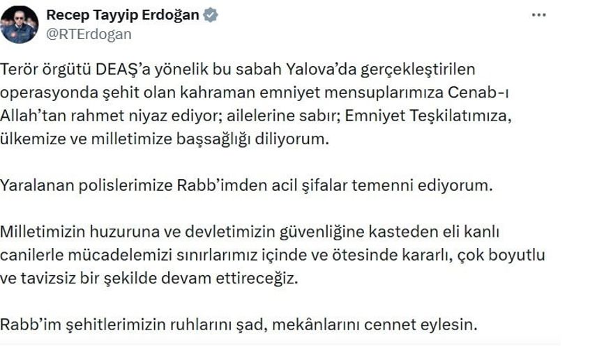 Cumhurbaşkanı Recep Tayyip Erdoğan, Yalova’da DEAŞ terör örgütüne yönelik operasyonda şehit düşen emniyet mensupları için taziye mesajı yayımladı. Erdoğan, terörle mücadelenin kararlılıkla süreceğini belirtti.