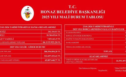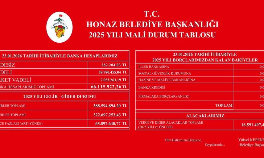 Mali tablomuza göre; belediyemizin banka hesapları düzenli ve güçlü bir yapıdadır. Kamu kurumlarına ve bankalara herhangi bir borcumuz bulunmamaktadır. 2025 yılı bütçemiz 65 milyon 897 bin 640,77 TL fazla vermiştir. Göreve geldiğimiz günden itibaren Belediyemiz’in öz kaynakları ile toplamda 865 milyon TL yatırım yaptık. Honaz’ın her kuruşu, yine Honaz için; hizmete, yatırıma ve geleceğe harcanmaktadır.