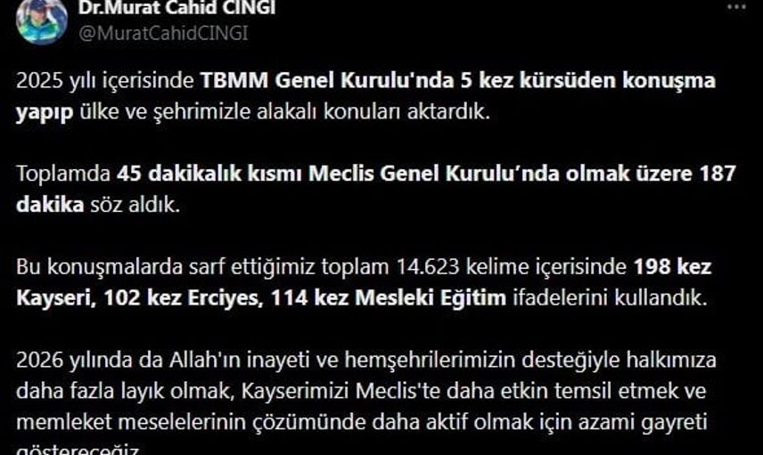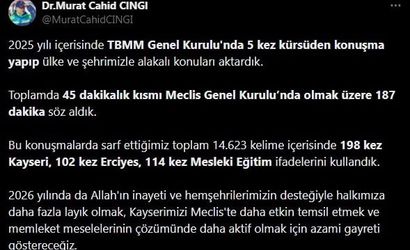 "2025 yılı içerisinde TBMM Genel Kurulu’nda 5 kez kürsüden konuşma yapıp ülke ve şehrimizle alakalı konuları aktardık. Toplamda 45 dakikalık kısmı Meclis Genel Kurulu’nda olmak üzere 187 dakika söz aldık. Bu konuşmalarda sarf ettiğimiz toplam 14 bin 623 kelime içerisinde 198 kez Kayseri, 102 kez Erciyes, 114 kez mesleki eğitim ifadelerini kullandık. 2026 yılında da Allah’ın inayeti ve hemşehrilerimizin desteğiyle halkımıza daha fazla layık olmak, Kayserimizi Meclis’te daha etkin temsil etmek ve memleket meselelerinin çözümünde daha aktif olmak için azami gayreti göstereceğiz"