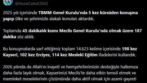 AK Parti'li Murat Cahid Cıngı, 2025 TBMM faaliyetlerini açıkladı: 5 kürsü konuşması, 187 dakika söz; 2026'da Kayseri'yi Meclis'te daha etkin temsil edeceklerini söyledi.