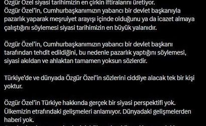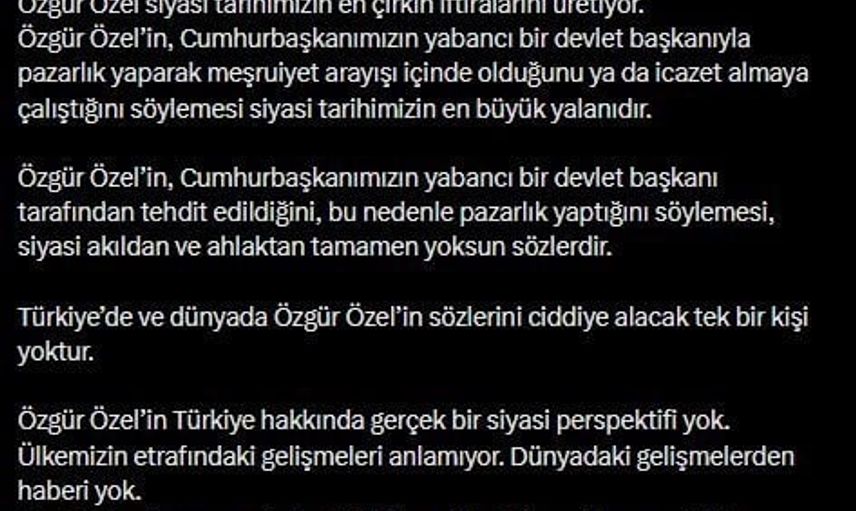 Devamında, "Özgür Özel’in Cumhurbaşkanımızın yabancı bir devlet başkanı tarafından tehdit edildiğini, bu nedenle pazarlık yaptığını söylemesi, siyasi akıldan ve ahlaktan tamamen yoksun sözlerdir" değerlendirmesinde bulunan Çelik, bu sözlerin Türkiye'de ve dünyada ciddiye alınmayacağını savundu.