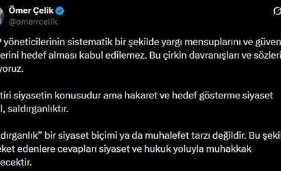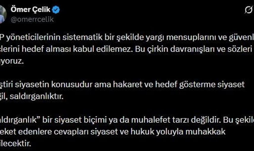 AK Parti Sözcüsü Ömer Çelik, sosyal medya hesabından yaptığı paylaşımda, CHP yöneticilerinin sistematik bir şekilde yargı mensuplarını ve güvenlik güçlerini hedef almasının kabul edilemez olduğunu bildirdi.
