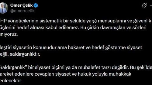 AK Parti Sözcüsü Ömer Çelik, CHP yöneticilerinin yargı ve güvenlik güçlerini hedef almasını kınadı: "Hakaret ve hedef gösterme siyaset değil, saldırganlıktır."