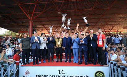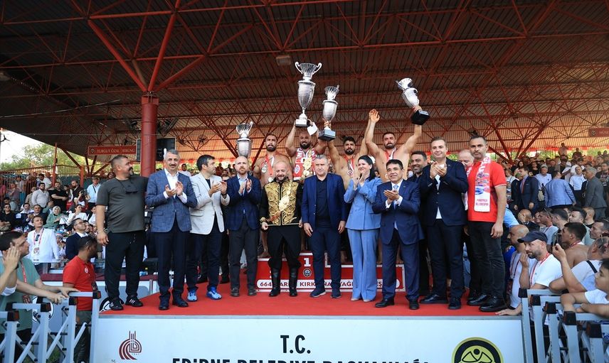 664. Tarihi Kırkpınar Yağlı Güreşleri'nin başpehlivanı Orhan Okulu, ikinci olan Feyzullah Aktürk ve üçüncülüğü paylaşan Ali İhsan Batmaz ile Enes Doğan, düzenlenen törenle kupalarını aldı. Ödül törenine, Edirne Valisi Yunus Sezer, (solda) ile Gençlik ve Spor Bakanı Osman Aşkın Bak (sol 5) da katıldı.