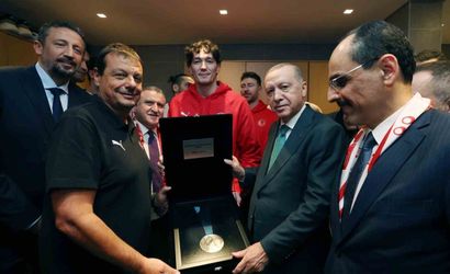 Bu özel buluşmada, A Milli Erkek Basketbol Takımı'nın Avrupa ikinciliği madalyası, takım kaptanı ve oyuncular tarafından Cumhurbaşkanı Erdoğan'a takdim edildi.
