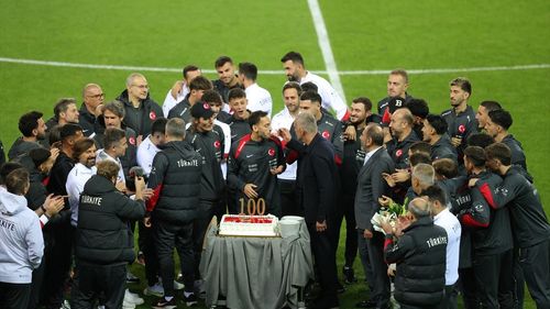 A Milli Takımı, 2026 Dünya Kupası Avrupa Elemeleri'nde Gürcistan maçı öncesi Kocaeli Stadı'nda yürüyüş yaptı; Hakan Çalhanoğlu için 100. forma pastası kesildi.