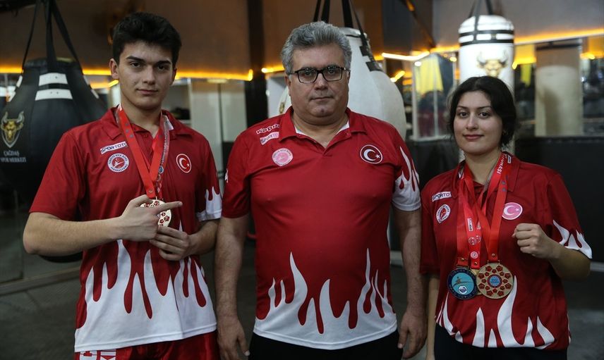Antalya'da düzenlenen Gençler ve Büyükler Türkiye Kick Boks Şampiyonası'nda kendi kategorilerinde altın madalya kazanan Muhittin (17) ve Fatma Nursev Akaltun (19), yeni şampiyonluklara birlikte uzanmak için çalışmalarını sürdürüyor.