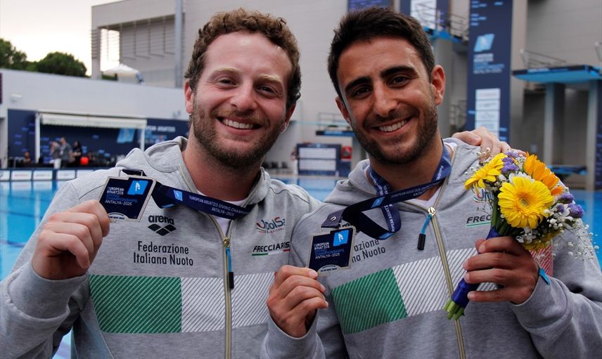 Avrupa Yüzme Birliği (European Aquatics) tarafından Antalya'da düzenlenen Avrupa Su Sporları Atlama Şampiyonası'nda üçüncü gün yarışları sona erdi. Erkekler senkronize 3 metre tramplen finalinde Almanya’dan Moritz Linus Weseman – Timo Barthel ikilisi birinci (ortada), İtalya’dan Giovani Tocci – Lorenzo Marsaglia ikilisi ikinci (solda), Büyük Britanya’dan Leon Baker – Hugo Thomas ikilisi ise üçüncü (sağda) oldu.