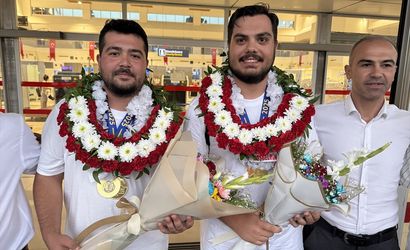 Fransa'da düzenlenen Avrupa Ateşli Silahlar ve Plak Atışları Şampiyonası'nda altın madalya kazanan Muhammet Seyhun Kaya (solda) ve Ali Can Arabacı (sağda), memleketleri Kahramanmaraş'ta çiçekle karşılandı.