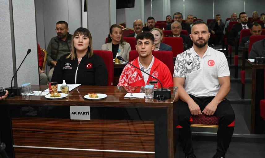 Milli sporcular Fatmagül Çevik ve Mustafa Erdoğan ile antrenör Ferit Şen, Isparta Belediye Meclisi’nin kasım ayı toplantısına misafir oldu. Belediye Başkanı Şükrü Başdeğirmen, toplantı öncesinde sporcular ve antrenörü altınla ödüllendirdi.